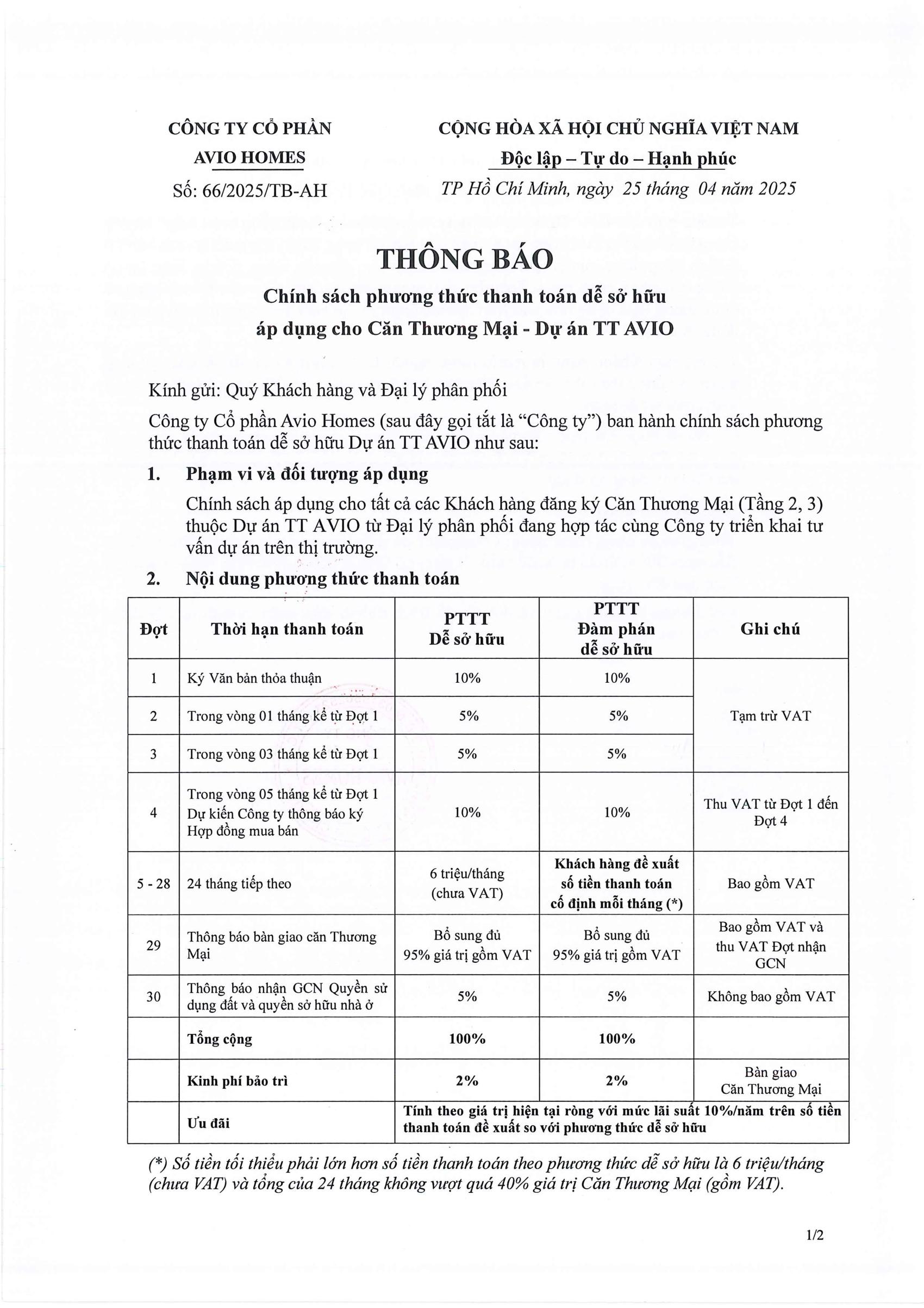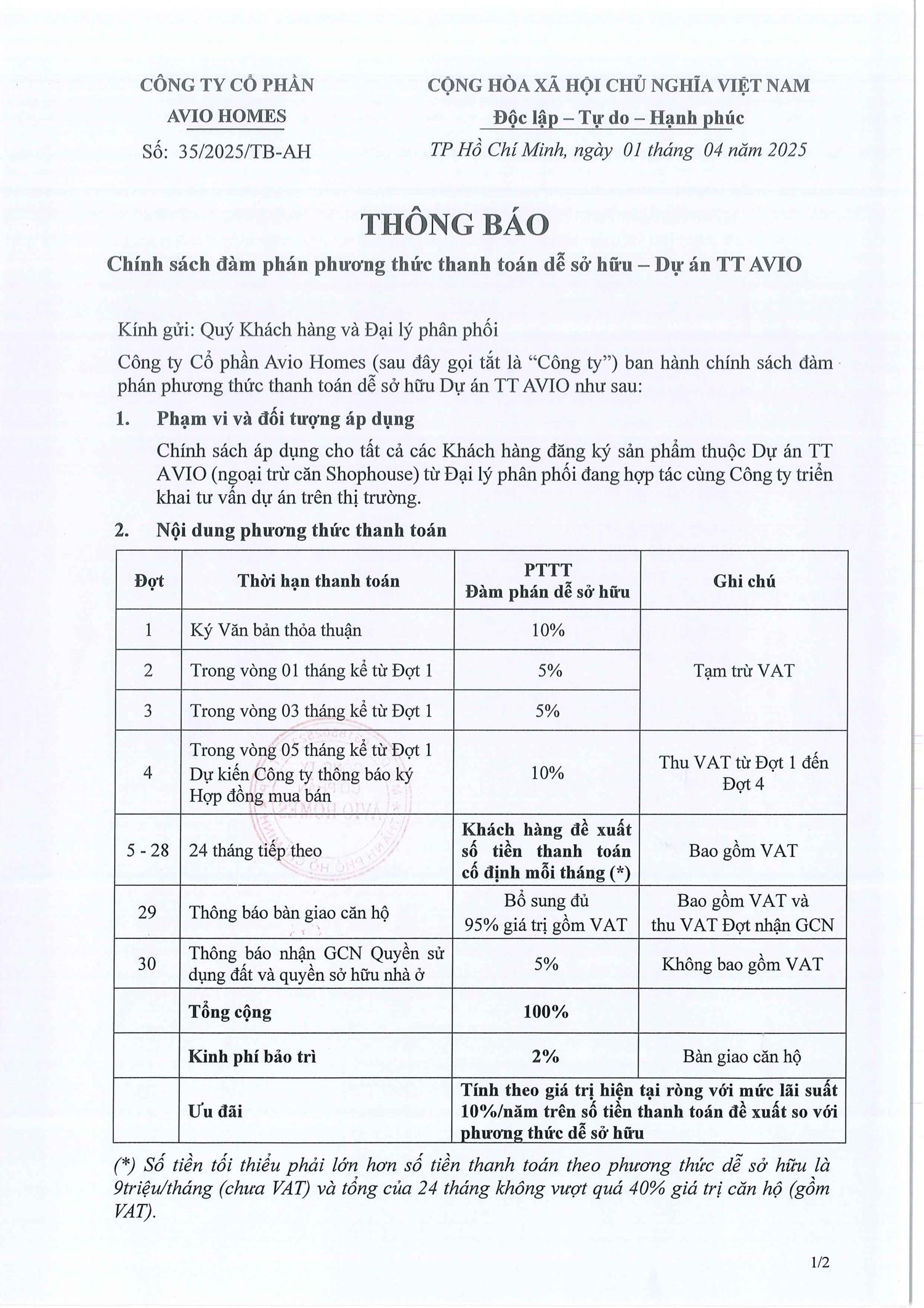 BÙM NỔ CHÍNH SÁCH BÁN HÀNG CĂN HỘ TT AVIO